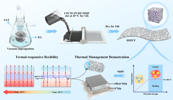 青海盐湖所溶液结构与界面课题组研讨团队以三水醋酸钠(SAT)作为相变资料,多孔胀大石墨构建封装空间,规划了一种无机相变薄膜。经过胀大石墨在不同方向层间交联构成3D多孔支撑骨架构建“热桥”,完成热量多维度传递。而且当电子器件临界热失控,相变薄膜自动贮存热量,该“热传导+热吸收”的两层热办理机制有用缓冲电子器件瞬时热通量,且PVDF的引进使相变薄膜取得热诱导柔性、杰出的阻燃与电绝缘功能。研讨结果使热失控电池模块温度下降10 ℃,CPU表面温度下降20 ℃。