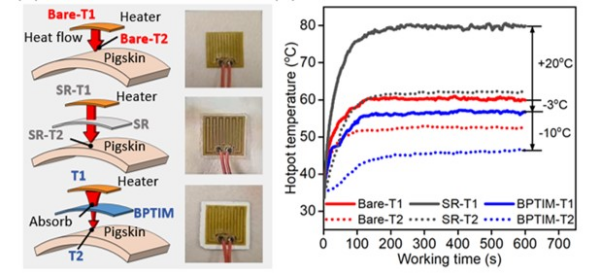 根据双接连相变热界面资料模仿可穿戴电子器件皮肤热办理示意图及不同状态下发热电子元件引起皮肤(模仿)表面温度变化状况比较